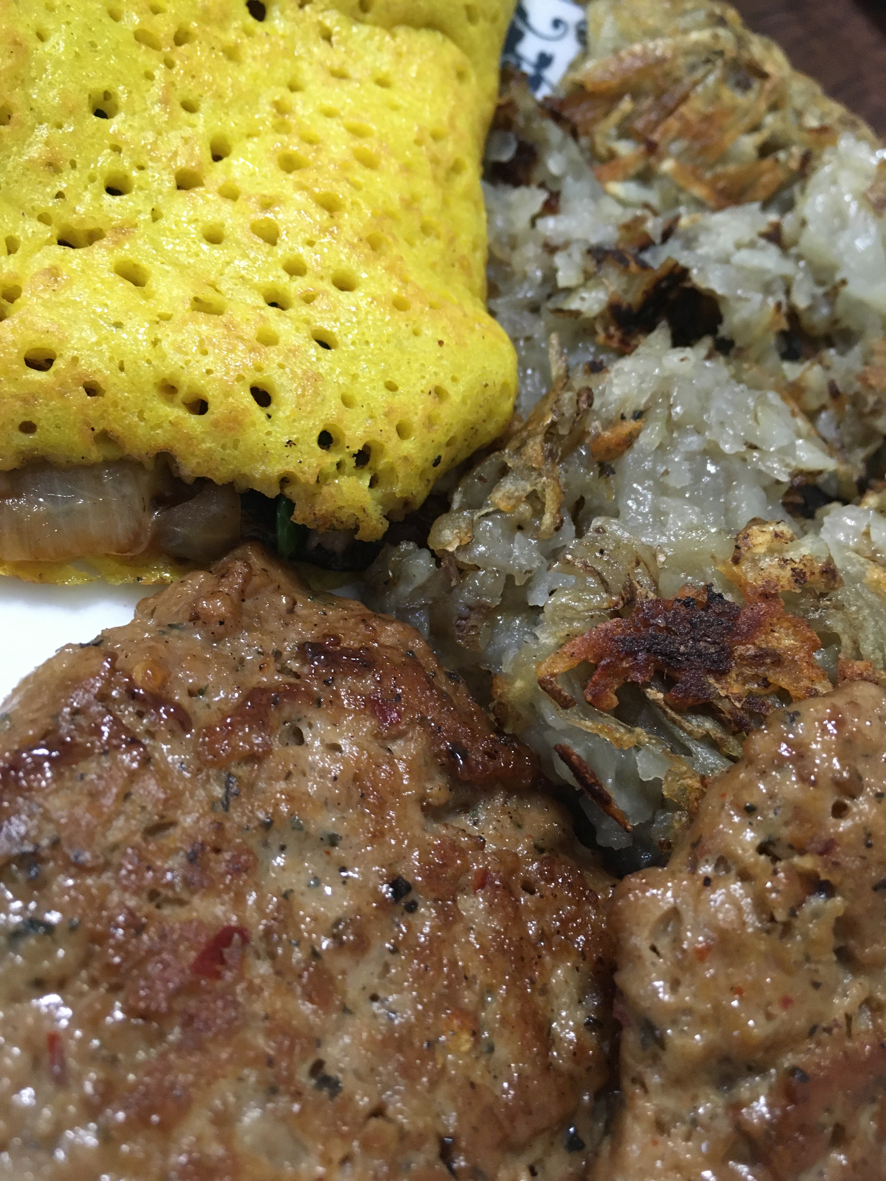 We didn't use all the Just Egg in our waffle experiments and so Matt played around with it in several additional ways--chxn fried rice, scrambled, as an omelette, etc.  They were all tasty and it was a really solid product.  I don't think it tastes anything like egg, but for me that's no downside.  It looks and acts like it though.